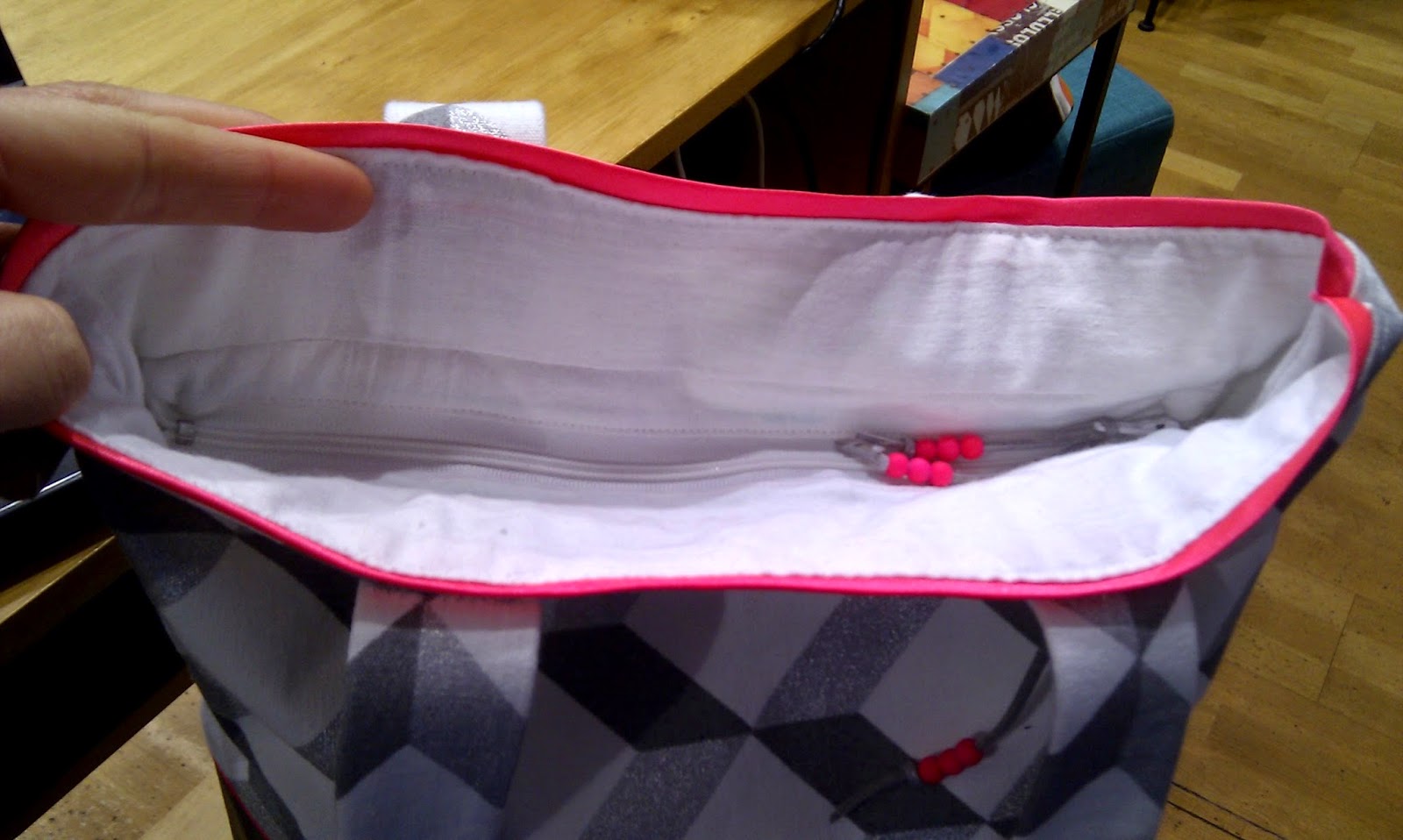 Le simili argenté, le tissus externe, le lien en cuir argenté, les perles et le biais rose fluo, de même que la tirette rose de la poche interne (donc si on récapitule, tout le sac sauf la doublure et la tirette blanche) viennent d'un Chouette Kit.